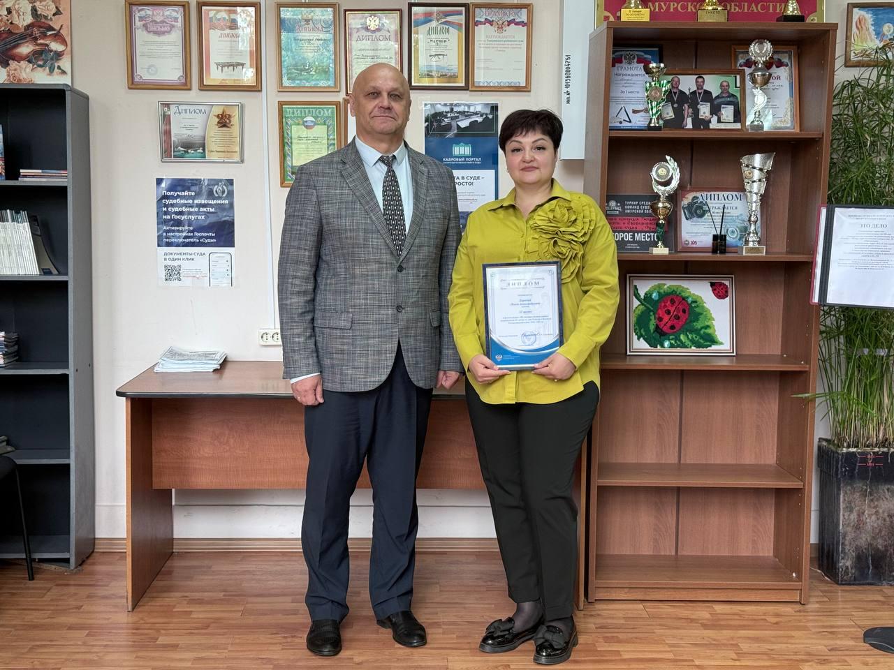 Также Владимир Дмитриевич вручил диплом Олесе Бородай, секретарю судебного заседания Тындинского районного суда, которая заняла третье место в фотоконкурсе «По местам боевой славы». Это достижение стало результатом её упорного труда и творческого подхода к теме конкурса. Завершая мероприятие, председатель суда Владимир Капустянский выразил уверенность в том, что судьи, работники суда и их семьи будут и впредь активно участвовать в подобных патриотических акциях. Он отметил, что такие мероприятия не только укрепляют связь между поколениями, но и помогают сохранить память о тех, кто сражался за свободу и независимость нашей страны. Участие в подобных конкурсах и выставках — это не только возможность проявить свои таланты, но и способ выразить уважение к тем, кто сделал возможной нашу жизнь в мирное время, сказал Владимир Дмитриевич. |